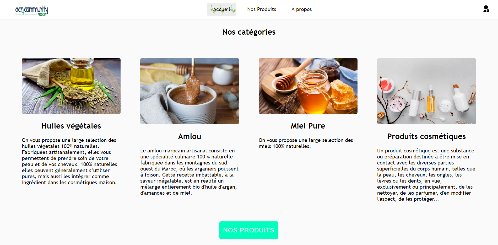 Act4Community By OCP is an association helping small cooperatives to present their products to client wherever in the world. This web site is where clients can find all the natural products and the informations about Moroccan cooperatives.